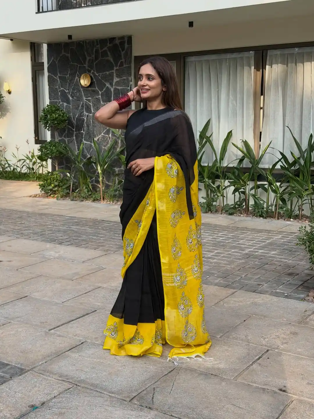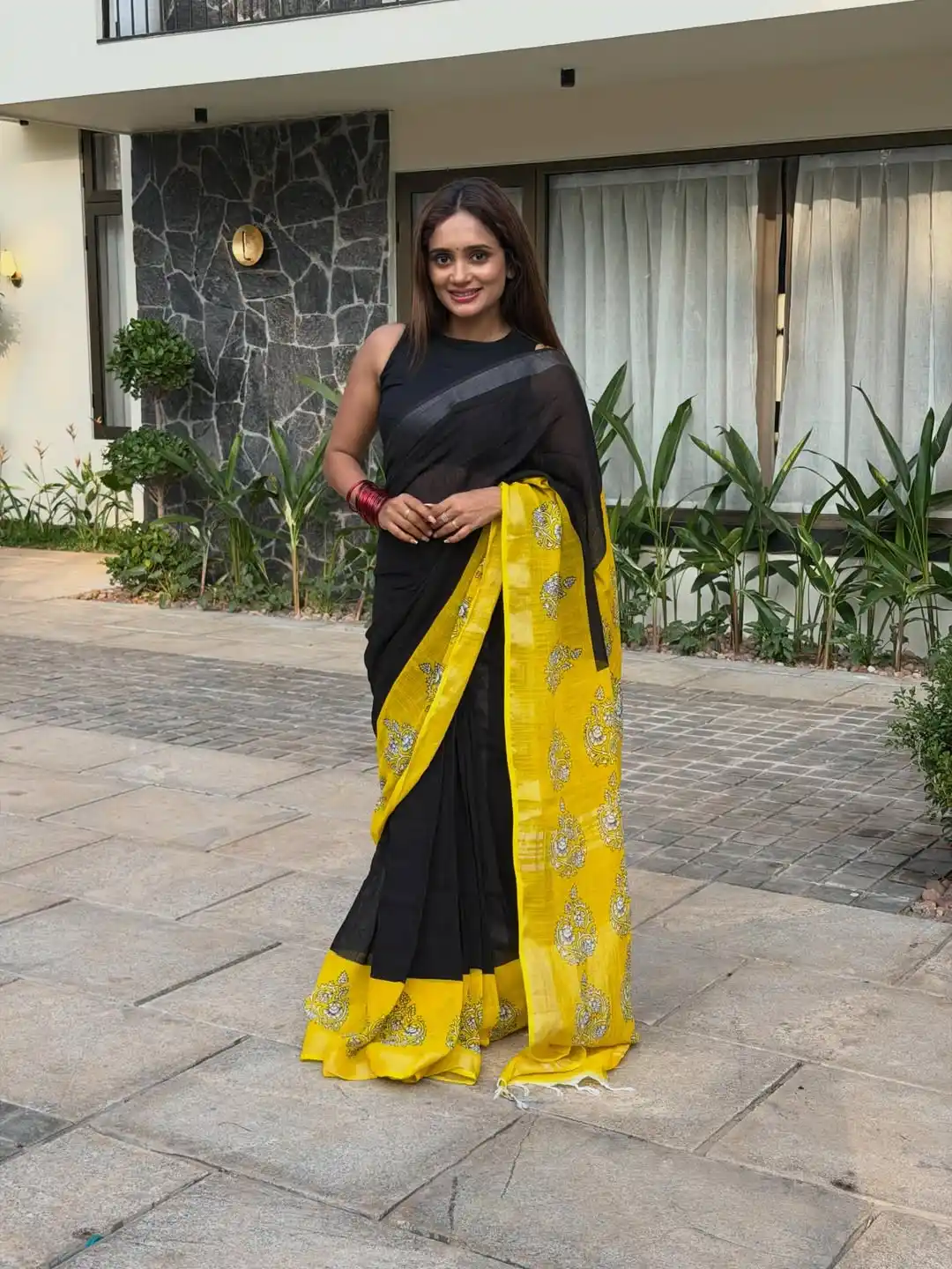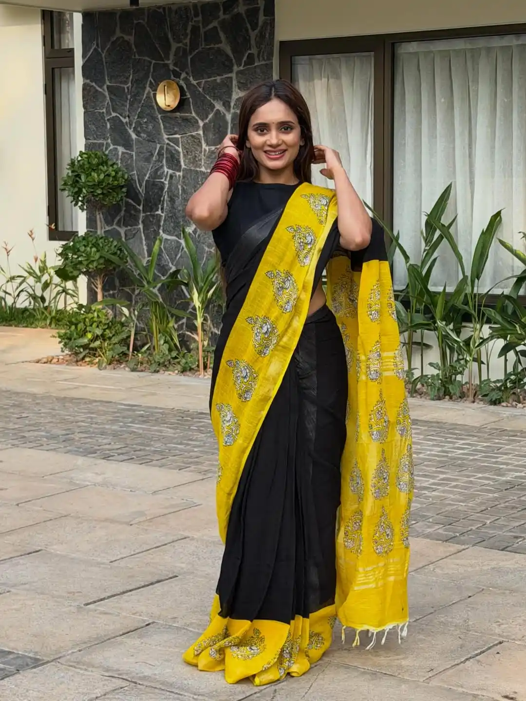 Soft Black yellow Linen Cotton Saree