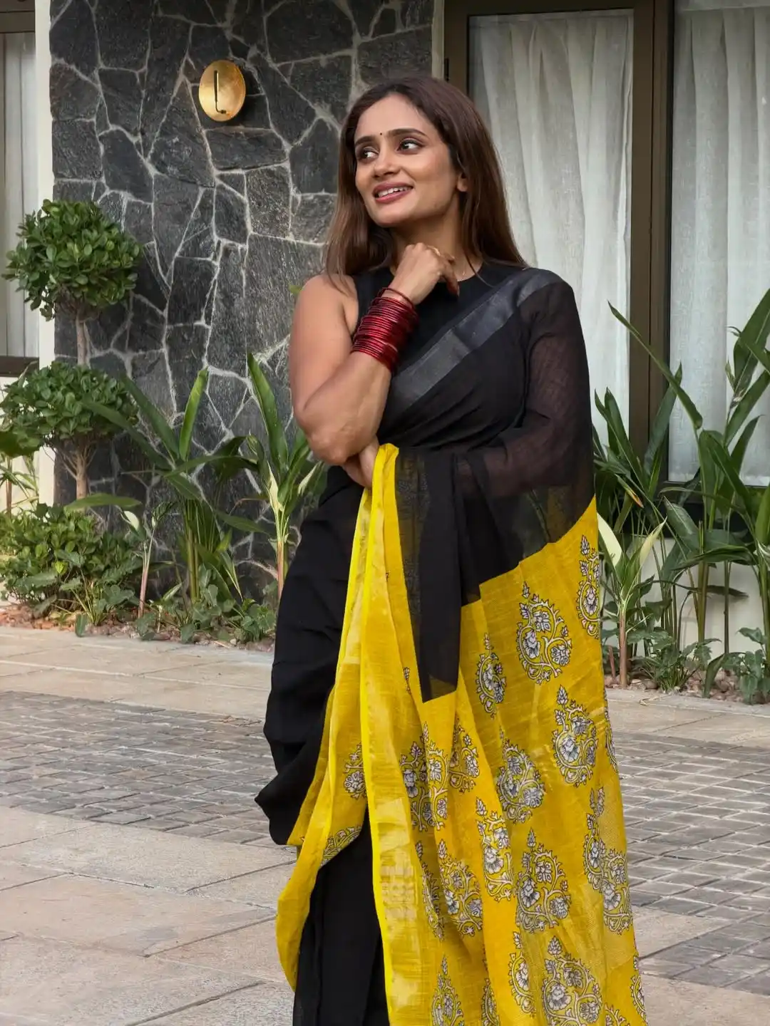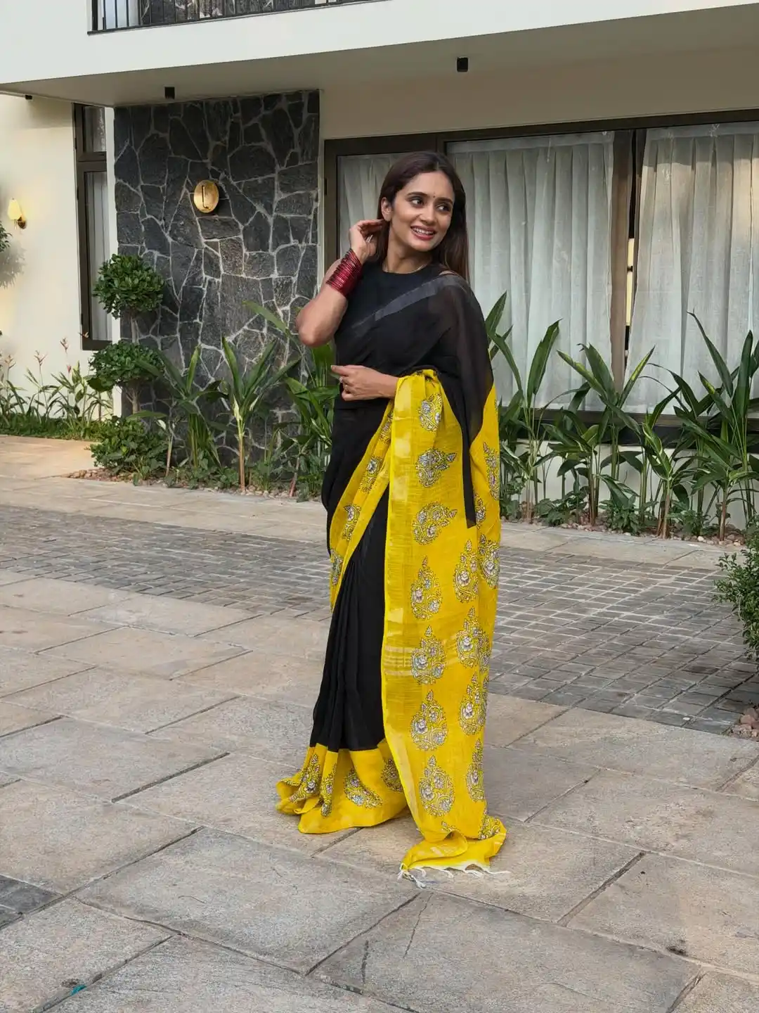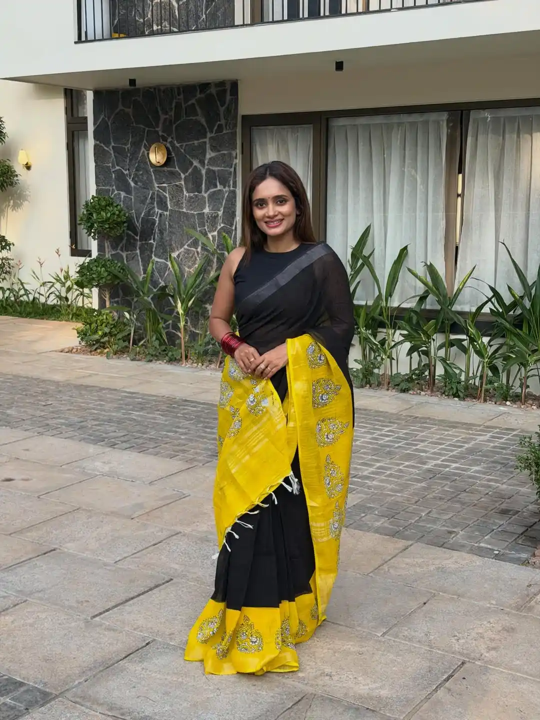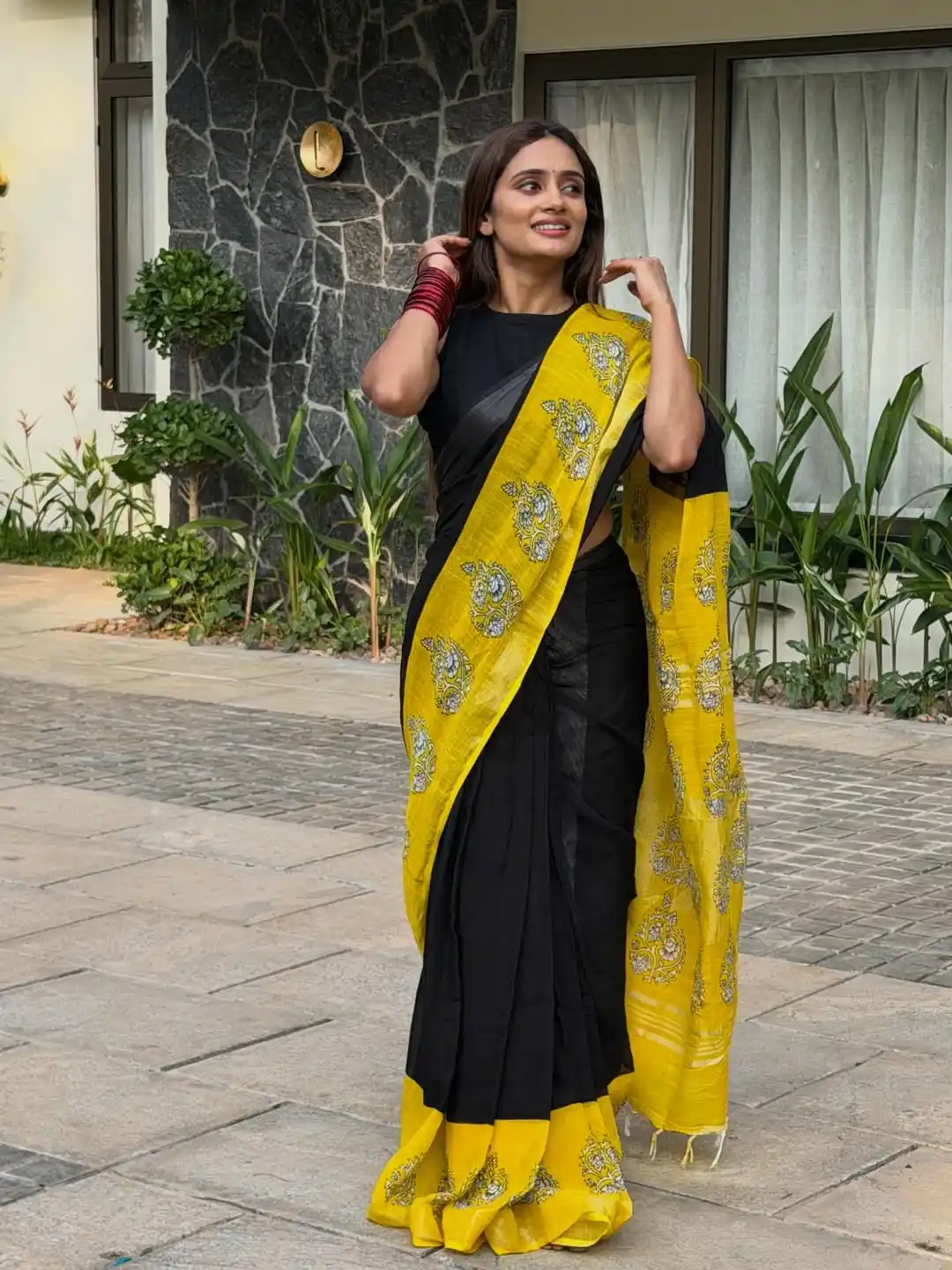 Soft Black yellow Linen Cotton Saree